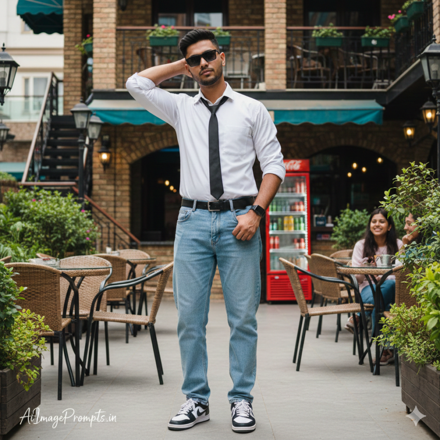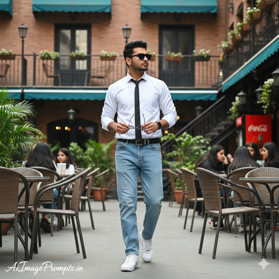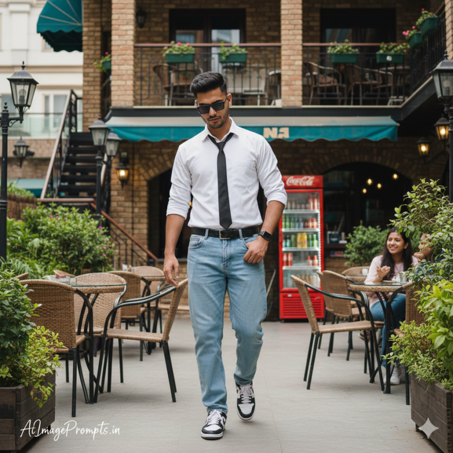 IMPORTANT – FACE LOCK Keep the subject’s face 100% original and unchanged. No face reshaping, no beauty filter, no AI facial modification. Maintain exact identity, skin texture, pores, and expression. Face must remain crystal-clear and perfectly matched. PROMPT: Create an ultra-realistic outdoor café lifestyle photograph that looks exactly like a real DSLR/mobile street photo taken during daytime. SUBJECT DETAILS: Young Indian man with average build. Natural brown skin tone with real texture. Short, tidy hairstyle. Light beard and moustache. Dark rectangular sunglasses. Confident, relaxed café presence. OUTFIT DETAILS: • White full-sleeve shirt (neatly pressed) • Slim black necktie properly adjusted • Light blue Rolax jeans • Black leather belt • Nike white sneakers • Black Apple smartwatch • Minimal, classy café styling POSE & BODY LANGUAGE: • Walking slowly through café courtyard • One hand in trouser pocket • Other hand holding sunglasses near chest • Head slightly turned sideways • Body mid-step, candid movement • Full body clearly visible EXPRESSION: Cool, composed expression. No smile. Natural human attitude. Eyes looking past the camera. BACKGROUND & ENVIRONMENT: Outdoor café seating area. Wicker chairs and round glass tables. Green plants and shrubs surrounding walkway. Multi-storey brick café building. Balconies with blue-green awnings. Outdoor staircase and railings. Decorative street lamps. Coca-Cola refrigerator visible. Girls seated at tables, watching casually. Clean tiled flooring. LIGHTING: Pure natural daylight. Soft even lighting on face. Realistic shadows on ground. No cinematic grading. CAMERA & COMPOSITION: Eye-level candid framing. Natural lens look. Everything crystal clear. 0% blur. 0% bokeh. 0% depth-of-field effects. STYLE & QUALITY: Hyper-realistic documentary photography. No filters. No beautification. Visible textures on clothes, furniture, plants. Looks like a genuine real-world café moment. TEXT / SIGNATURE: Add “AiImagePrompts.in” at the bottom-left corner, handwritten signature-style typography, thin cursive strokes, small size, subtle premium elegance, white or soft off-white color. ASPECT RATIO: 3:4 vertical