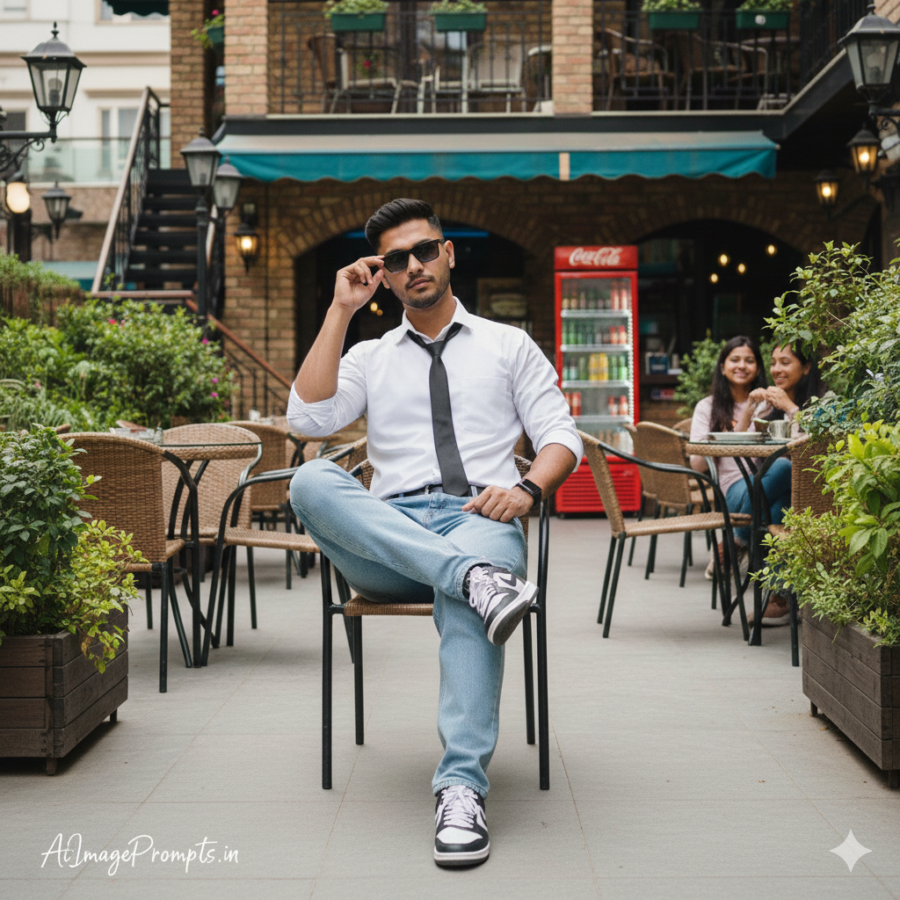 IMPORTANT – FACE LOCK Use the uploaded photo as the ONLY facial reference. Do NOT change facial structure, jawline, eyes, nose, lips, beard, hairline, skin tone, age, or expression. No beautification, no smoothing, no AI face regeneration. Preserve real skin texture, pores, and natural asymmetry. Face must be 100% identical, ultra-sharp, instantly recognizable. PROMPT: Ultra-realistic real-life outdoor café lifestyle photograph, captured like a raw DSLR/mobile photo in a real café courtyard. The image must look completely natural and non-AI. SUBJECT DETAILS: Young Indian man, average build. Medium brown natural skin tone with visible pores. Short neatly styled hair. Light beard and moustache. Dark rectangular sunglasses. Calm, confident, relaxed personality. OUTFIT DETAILS: • White formal shirt (top buttons slightly open) • Sleeves neatly folded • Slim black necktie loosened • Light blue loose-fit Rolax jeans • Black leather belt • Nike white/black sneakers • Black Apple smartwatch • Clean café-fashion aesthetic POSE DETAILS: • Sitting casually on a wicker café chair • One leg crossed over the other • One elbow resting on chair arm • Hand lightly touching the sunglasses frame • Body relaxed, chest open • Full body visible, natural seated posture EXPRESSION DETAILS: Neutral calm expression. Sharp jawline visible. No smile, no exaggeration. Eyes angled slightly toward camera. BACKGROUND & ENVIRONMENT: Open café courtyard. Round glass tables nearby. Wicker chairs arranged casually. Green plants and shrubs around. Brick café building with balconies. Blue-green awnings. Outdoor staircase visible. Decorative street lamps. Coca-Cola refrigerator in background. Few girls seated behind, smiling and chatting naturally. Clean tiled flooring. LIGHTING: Natural daylight only. Soft diffused sunlight. Balanced highlights and shadows. True-to-life colors. No artificial lighting. CAMERA & QUALITY: Full-body lifestyle portrait. Eye-level camera angle. Natural lens perspective. 100% sharp focus everywhere. ABSOLUTELY NO blur, bokeh, or depth-of-field. STYLE: Hyper-realistic documentary photography. No filters. No beautification. Visible fabric texture, chair weave, plant leaves. Looks like a real photo clicked by a human. TEXT / SIGNATURE: Add “AiImagePrompts.in” at the bottom-left corner, handwritten signature-style typography, thin cursive strokes, small size, subtle premium elegance, white or soft off-white color. ASPECT RATIO: 3:4 vertical