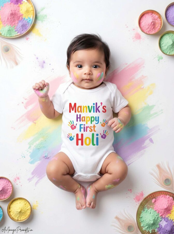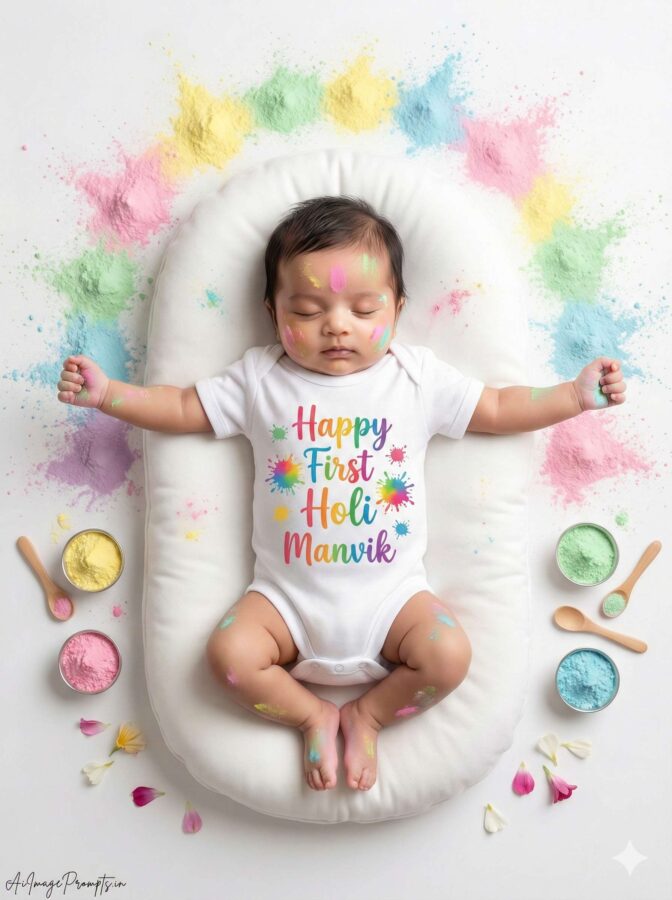 Ultra-realistic 8K RAW studio portrait of a newborn baby girl lying flat on her back in a bright high-key Holi-themed photoshoot, wearing a white premium cotton onesie with bold rainbow typography reading “Manvik’s Happy First Holi” and tiny colorful handprint graphics printed on the fabric, soft light pastel gulal gently smeared on cheeks, tiny hands, and feet (very minimal, not heavy), pure white seamless studio backdrop with artistic abstract pastel gulal brush strokes (pink, yellow, green, blue, purple), mini rangoli plates, small color bowls, and feather fans neatly placed at frame corners, subtle frozen pastel powder bursts floating around for dynamic festive feel, high-key multi-light setup with multiple softboxes eliminating harsh shadows, bright even lighting across baby’s face, soft rim light outlining silhouette, slightly enhanced color contrast for vibrancy without harsh highlights, professional medium-format DSLR look, ultra-detailed 8K RAW clarity, sharp focus on baby’s face and onesie print, shallow depth of field with creamy bokeh from colorful background splashes, negative prompt: cartoon, CGI, painting, plastic skin, heavy color stains, distorted limbs, extra fingers, extra toes, low resolution, watermark except signature, add “AiImagePrompts.in” at bottom-left corner in small thin handwritten cursive signature style in soft white, aspect ratio 3:4 vertical.