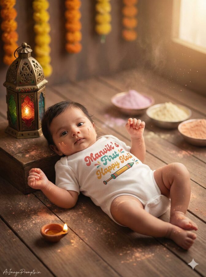 Ultra-realistic 8K RAW photograph of a newborn baby girl lying flat on her back in a vintage-inspired Holi studio setup, wearing a soft white cotton onesie with retro multicolor typography reading “Manvik’s First Happy Holi” and a small classic pichkari illustration, soft warm-toned gulal lightly dusted on cheeks, fingers, and toes with a subtle newborn-safe appearance, placed on a warm textured natural brown wooden floor with visible wood grain, a vintage brass lantern with colored glass panels beside the baby, a small traditional diya emitting a gentle glow, softly blurred bowls filled with pastel gulal in the background, marigold flower garlands hanging slightly out of focus, delicate powder particles floating in the air, golden hour simulation lighting with a warm side key light from the right, soft fill light from the left to balance shadows, subtle rim light outlining the baby’s silhouette, warm nostalgic cinematic color grading with soft shadow fall, professional medium-format DSLR look, 8K RAW hyper-detailed clarity, sharp focus on baby’s face and onesie print, shallow depth of field with creamy vintage bokeh, natural skin tones preserved, negative prompt: cartoon, CGI, painting style, plastic skin, heavy powder stains, distorted limbs, extra fingers, low resolution, watermark except signature, add “AiImagePrompts.in” at the bottom-left corner in small thin handwritten cursive signature-style typography in soft white or off-white color, aspect ratio 3:4 vertical