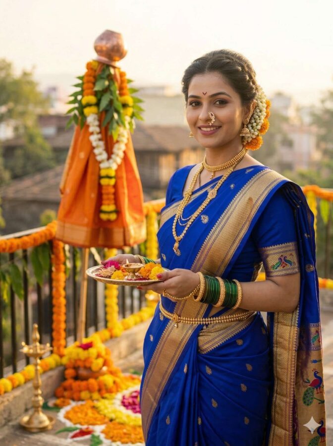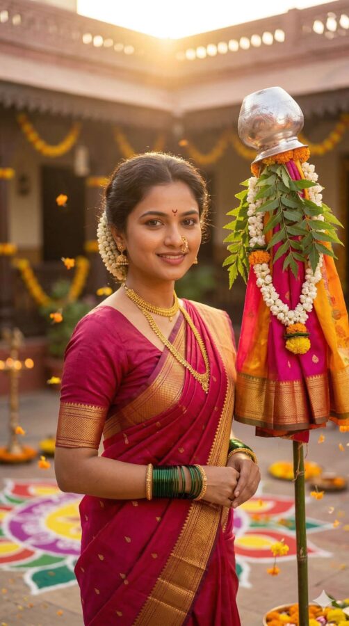 A hyper-realistic cinematic portrait of a beautiful young Indian woman celebrating the festival of Gudi Padwa. She is dressed in a vibrant traditional Paithani nauvari saree with intricate temple jewellery, a chandrakor bindi, classic Maharashtrian nath, and stacks of green glass bangles. Her hair is elegantly styled with a fresh floral gajra, adding to the authentic festive appearance. She stands gracefully on a decorated balcony filled with festive energy and bathed in warm golden morning sunlight, creating a soft cinematic glow. In the softly blurred background, a beautifully decorated Gudi flag stands tall with a saffron silk cloth, an upside-down brass kalash, neem leaves, mango leaf toran, and a traditional sugar garland symbolizing prosperity. The surroundings feature vibrant marigold garlands, glowing diya lamps, and a colorful rangoli design on the floor, enhancing the festive Maharashtrian atmosphere. Captured in ultra-realistic professional photography style with soft warm color grading, shallow depth of field, natural skin texture, realistic shadows, and 8K resolution, creating a rich cultural portrait with a strong Gudi Padwa 2026 festival vibe and traditional attire inspiration.