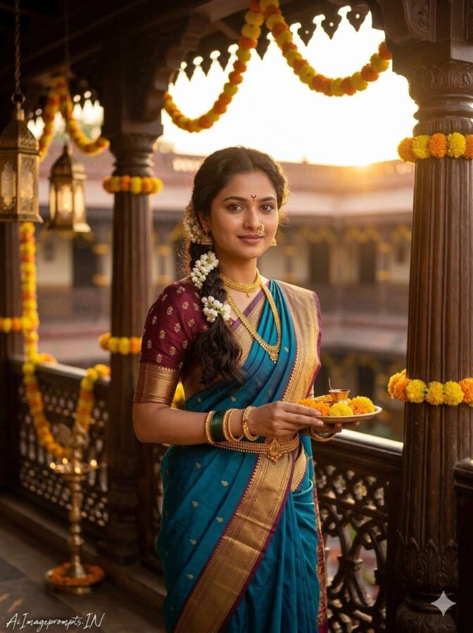 Create an ultra-realistic Indian festive portrait during Gudi Padwa while keeping my face 100% identical to the reference image with no face change, reshaping, or beautification. Maintain the exact jawline, eye shape, eyebrow thickness, nose bridge, lips, facial proportions, natural skin tone, and hairline. The face must have ultra-HD clarity with highly detailed natural skin texture and remain the sharpest element in the image so the person is perfectly recognizable. Use a 3:4 vertical aspect ratio and ultra-realistic Indian festive portrait photography in 8K DSLR quality with royal heritage photography style. The scene is a royal palace-style balcony decorated with festive marigold garlands and brass lanterns, featuring carved wooden railings and pillars with traditional Indian architectural details. In the background, a warm sunset sky casts golden light across the palace courtyard. The subject is a beautiful young Indian woman standing gracefully on the balcony during the celebration, with a glowing wheatish skin tone and elegant facial features. She has long dark wavy hair styled traditionally with fresh mogra flowers braided into the hair. She stands beside the carved balcony railing in a “Royal Balcony Pose,” holding a small brass plate filled with marigold flowers. Her expression shows a gentle confident smile with serene expressive eyes looking slightly past the camera. She wears an elegant peacock blue Paithani saree with a rich gold zari border and traditional motifs, paired with a deep maroon embroidered blouse. Traditional jewellery includes a Maharashtrian Nath nose ring, chandrakor bindi, layered gold necklace, bangles, and kamarbandh. The background shows palace architecture with carved pillars, marigold garlands, hanging brass lanterns, and a glowing sunset sky. Lighting uses golden hour side lighting that softly illuminates the face and jewellery. Shot using professional DSLR photography with an 85mm portrait lens and shallow depth-of-field, keeping the face ultra-sharp while the palace background remains softly blurred. Style should resemble ultra-real heritage fashion photography with rich colors and cinematic atmosphere. Negative prompts: blur, motion blur, soft focus, cartoon style, CGI look, plastic skin, distorted hands, extra fingers, watermark artifacts, low resolution. Add the text “AiImageprompts.IN” at the bottom-left corner in small handwritten signature-style cursive typography with thin strokes in white or soft off-white color for a subtle premium look.
