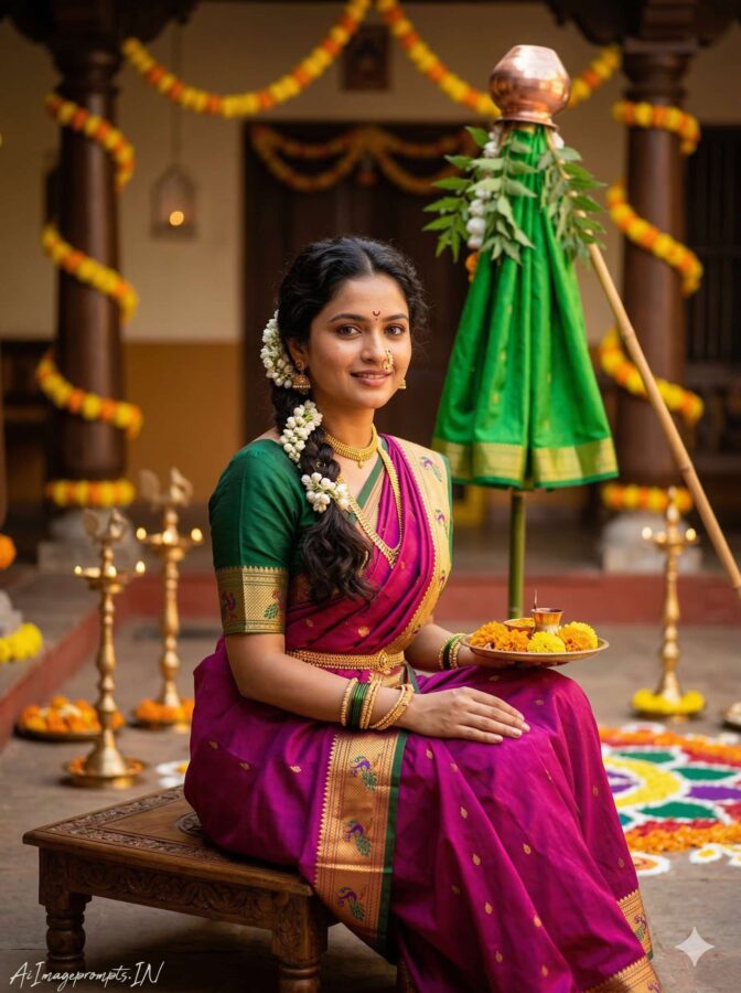Ultra-Realistic Gudi Padwa AI Festive Portrait Prompt (Exact Face Match | 8K DSLR Style): Keep my face 100% identical to the reference image with no reshaping, beautification, or facial changes—maintain the exact jawline, eye shape, eyebrow thickness, nose bridge, lips, facial proportions, natural skin tone, and hairline. The face must have ultra-sharp HD clarity with visible natural skin texture and pores, remaining the sharpest element in the frame. Create a 3:4 vertical ultra-realistic Indian festive portrait in cinematic 8K DSLR quality. The scene is a beautifully decorated Maharashtrian courtyard during the Gudi Padwa festival with vibrant rangoli made from colored powders and flower petals, softly glowing brass diyas, marigold garlands hanging across wooden pillars, and a traditional Gudi with silk cloth, neem leaves, and copper kalash placed behind the subject. A graceful young Indian woman with glowing wheatish skin tone sits elegantly on a carved wooden paat in a traditional festive sitting pose, one hand resting gently on her lap while the other holds a small brass plate filled with marigold flowers. She has long dark wavy hair styled traditionally with fresh white mogra flowers along the braid, a soft joyful smile, and calm expressive eyes looking slightly toward the camera. She wears a rich royal magenta Paithani nauvari saree with heavy gold zari border and peacock motifs paired with a deep green silk blouse, along with traditional Maharashtrian jewellery including a Nath nose ring, chandrakor bindi, gold thushi necklace, layered bangles, kamarbandh waist belt, and antique gold earrings. The background includes decorative rangoli on the floor, festive marigold garlands, glowing brass lamps, and the Gudi Padwa Gudi creating an authentic celebration atmosphere. Lighting combines warm natural daylight with soft festive lamp glow illuminating the face and jewellery. Shot using a professional DSLR with an 85mm portrait lens and shallow depth-of-field, keeping the face ultra-sharp while the festive decorations remain softly blurred. Use vibrant authentic Indian color grading for a cinematic festive look. Negative prompts: blur, motion blur, soft focus, cartoon style, CGI look, plastic skin, distorted hands, extra fingers, watermark artifacts, low resolution. Add the text “AiImageprompts.IN” at the bottom-left corner in small handwritten signature-style cursive typography with thin strokes in white or soft off-white color for a subtle premium look.