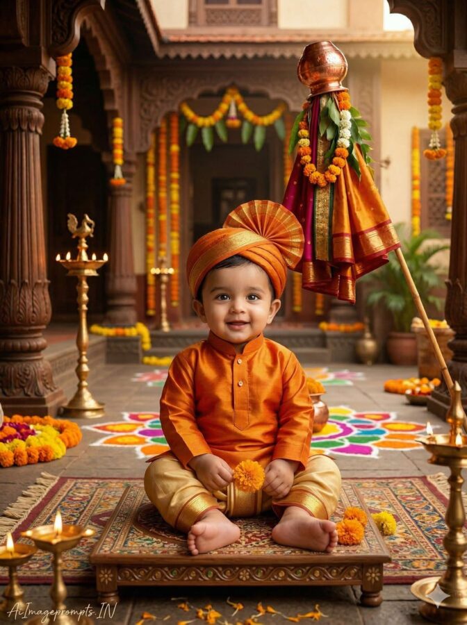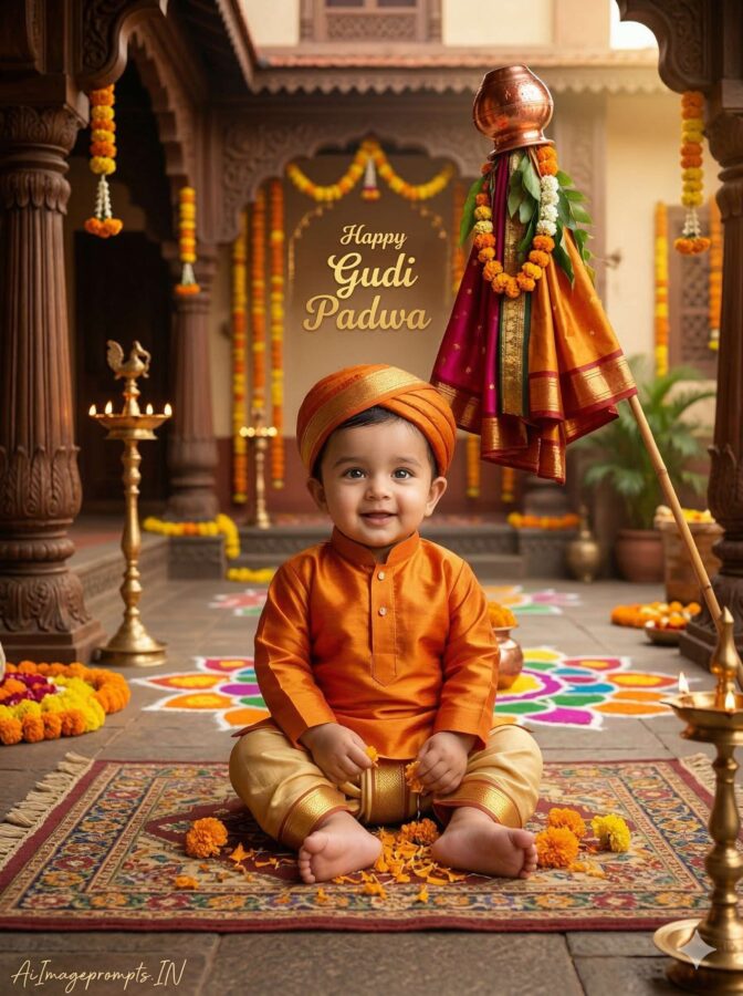 Generate charming baby-themed Gudi Padwa festival images with easy Gemini AI prompts. Ideal for greeting cards, reels, and festive designs.