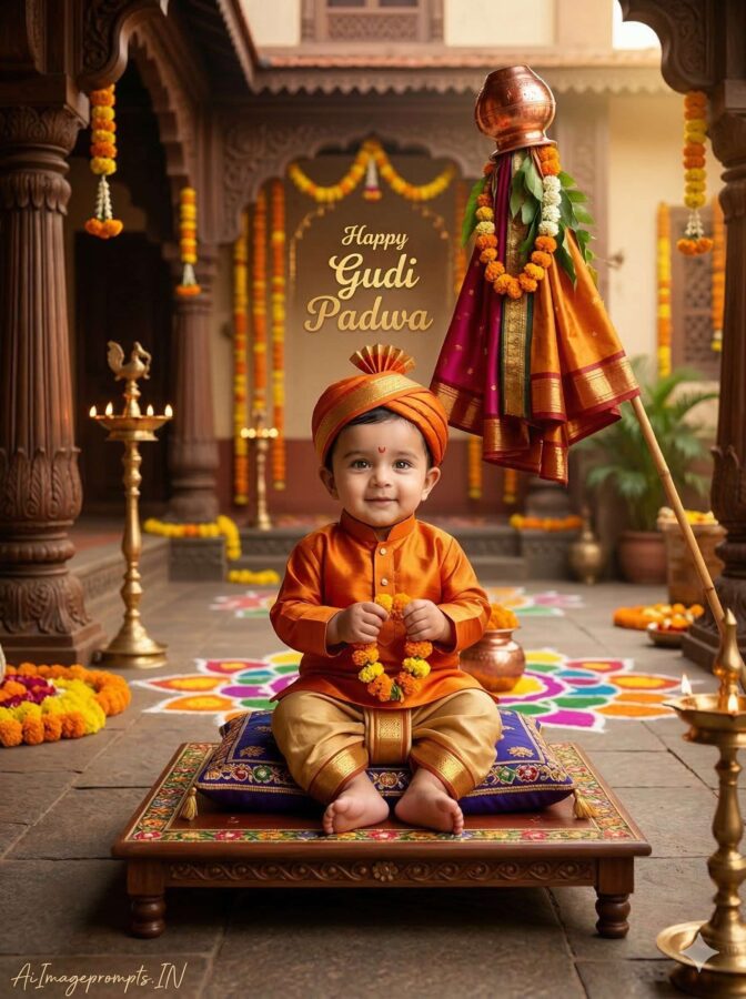 Create an ultra-realistic cinematic 4K baby portrait using the uploaded reference baby image as the exact facial identity, ensuring the baby’s face remains identical with the same eyes, cheeks, lips, nose, hairline, and natural skin tone with no beautification or reshaping. The portrait should feature ultra-HD facial clarity where the baby’s face is the sharpest element with natural skin texture visible. Place the adorable baby sitting proudly on a small royal cushion on a decorated wooden paat inside a royal Maharashtrian palace courtyard prepared for the Gudi Padwa festival, surrounded by carved wooden pillars, antique lamps, decorative arches, marigold garlands, brass lamps, and colorful rangoli artwork. Dress the baby in a traditional Maharashtrian baby prince outfit consisting of a tiny royal saffron silk kurta with golden border dhoti and a miniature pheta (turban). The baby should sit upright holding a small marigold flower garland while looking curiously toward the camera with bright joyful eyes and an innocent expression. Behind the baby, place a grand festive Gudi flag decorated with silk cloth and a copper kalash. Use soft golden festive lighting mixed with natural daylight to create a cinematic glow. Include elegant golden typography in the background reading “Happy Gudi Padwa”. Capture the scene in professional DSLR style using an 85mm portrait lens with cinematic depth-of-field and ultra-realistic detail. Add the signature “AiImageprompts.IN” at the bottom-left corner in small handwritten cursive typography with thin strokes in white or soft off-white color, maintaining a premium look, with a 3:4 vertical aspect ratio.