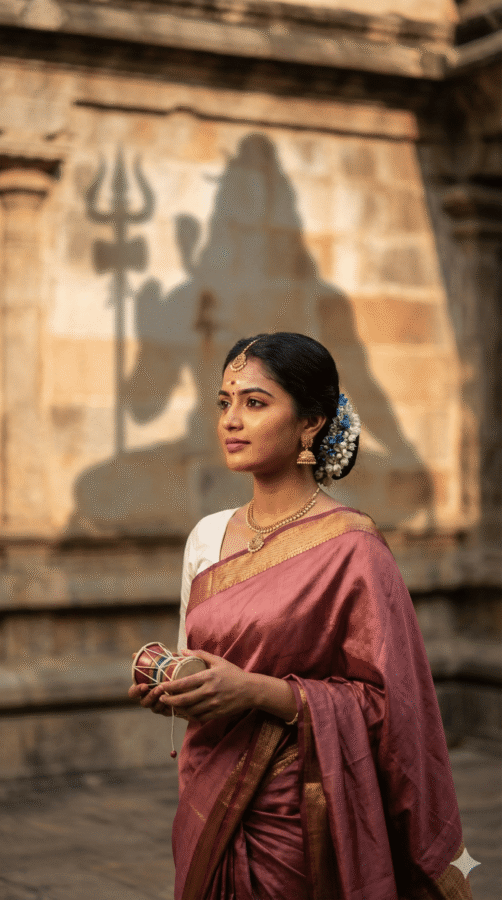 Create an ultra-realistic, cinematic vertical portrait (9:16) of a graceful Indian woman inspired by Goddess Parvati. She is wearing a deep rosewood-colored silk saree with an elegant, finely detailed golden border, paired with a pure white blouse. She is adorned with traditional golden jhumka earrings, a delicate gold necklace, and a beautifully crafted gold maang tikka.