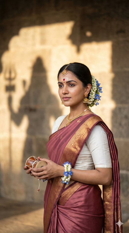 Her hair is styled in a neat low bun, beautifully decorated with fresh blue and white flowers. She wears a white and blue floral bracelet on her wrist. She is gently holding a small damru, her body slightly tilted toward the camera, with a calm, devotional expression.