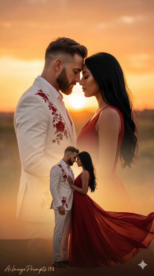 A hyper-realistic romantic couple photoshoot in a 9:16 vertical composition, captured during a warm golden sunset with an artistic double-exposure effect. The frame is vertically balanced, with the couple placed slightly above center to emphasize depth and storytelling.