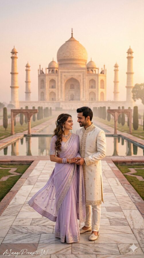 A hyper-realistic romantic Indian pre-wedding photoshoot in a 9:16 vertical composition, set in front of the iconic Taj Mahal during a serene sunrise, where the monument glows in warm golden light. The couple stands in the lower-middle frame, side by side, gently turned toward each other, sharing an affectionate gaze that captures deep emotional connection. The woman wears a graceful light lavender saree flowing softly with movement, while the man complements the scene in an elegant ivory sherwani, enhancing the royal aesthetic. The upper portion highlights the full symmetry of the Taj Mahal with a soft misty atmosphere and smooth sky gradient, creating a dreamy cinematic feel. Use shallow depth of field to keep the couple in sharp focus with a softly blurred background, along with natural skin tones and hyper-realistic detailing. Ensure the couple’s facial features remain 100% identical to the reference image with no alterations. Add “AiImagePrompts.IN” at the bottom-left corner in a handwritten signature style, thin cursive strokes, small size, and subtle premium elegance in white or soft off-white color.