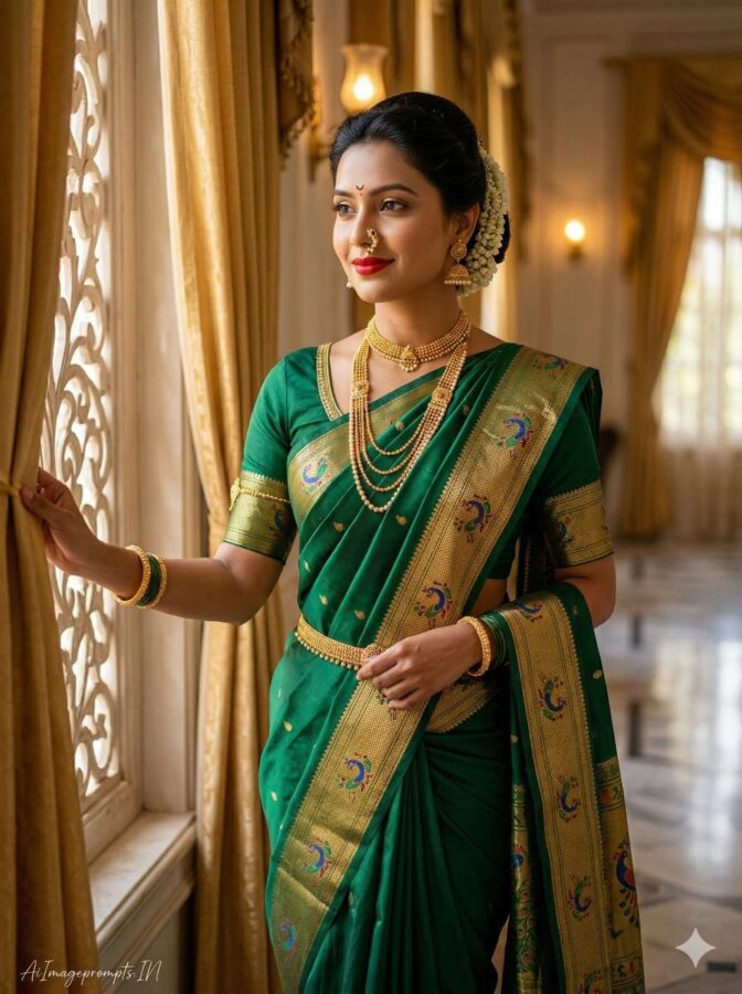 Create a hyper-realistic 8K cinematic vertical (3:4) bridal portrait of the girl from the reference image as a traditional Maharashtrian bride standing beside a grand royal palace window, styled like a luxury Indian wedding editorial photoshoot with ultra-sharp facial clarity and natural realism. Use the uploaded reference image strictly as the facial identity source and maintain 100% facial accuracy with no changes to eye shape, eyelids, eyebrows, nose, lips, jawline, cheek structure, proportions, hairline, or skin tone. The face must look completely natural with visible skin texture, pores, and realistic lighting, and it must remain the sharpest part of the image with crystal-clear eye detail and zero blur. The bride stands gracefully near a tall carved palace window, one hand gently touching the curtain while the other holds the saree pallu, looking slightly outside with a soft and confident smile. She wears a deep emerald green Paithani silk saree with rich gold zari borders and peacock motifs, draped in traditional Maharashtrian style. Adorn her with authentic Maharashtrian bridal jewelry without mundavalya, including a subtle chandrakor bindi, traditional nath, jhumka earrings, thushi necklace, layered gold necklaces, kamarpatta waist belt, gold bangles, and armlets. Her hair is styled in a neat traditional bun decorated with white jasmine gajra and subtle gold hair pins, paired with elegant bridal makeup featuring bold red lips, soft gold eye makeup, and natural radiant skin. The background features a luxurious palace interior with tall carved windows, golden curtains, marble flooring, and soft sunlight entering from the side, softly blurred to create cinematic depth. Use warm natural sunlight combined with soft golden interior lighting to enhance facial depth and jewelry shine, captured in ultra-realistic DSLR style using an 85mm portrait lens with sharp face focus and smooth depth-of-field. Avoid blur, soft focus, face distortion, CGI look, plastic skin, artificial smoothing, mundavalya, hanging pearls, or watermark artifacts. Add “AiImageprompts.IN” at the bottom-left corner in a small elegant handwritten signature style using thin cursive strokes in white or soft off-white color.