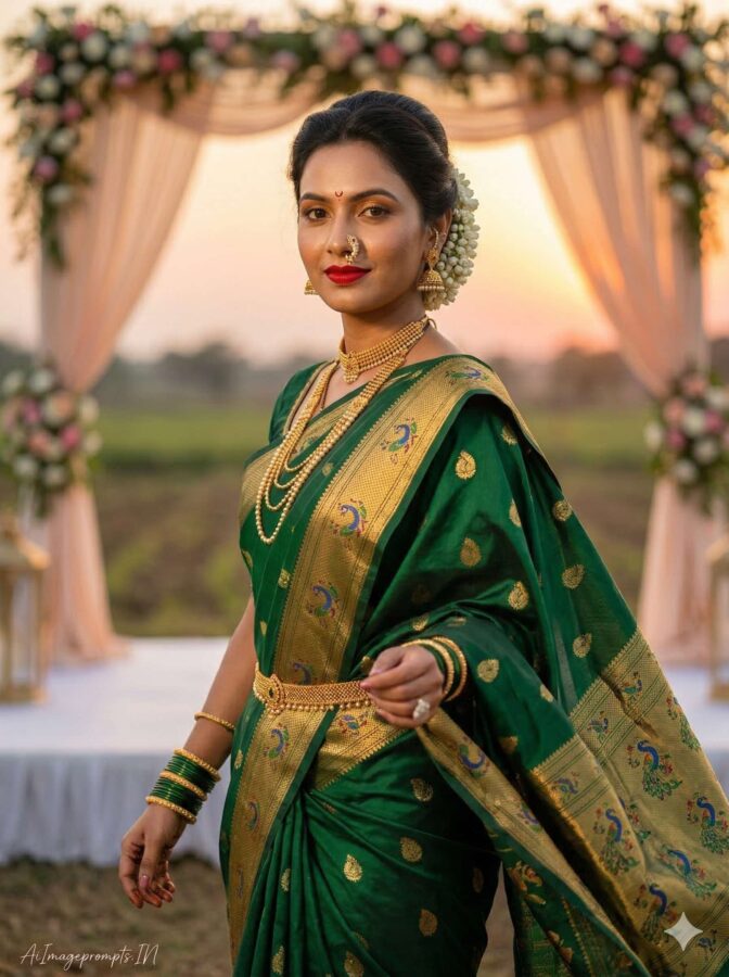 Maharashtrian Bride Gemini Prompt – Hyper Realistic 8K Golden Hour Outdoor Bridal Portrait (Face Lock, Vertical 3:4)
