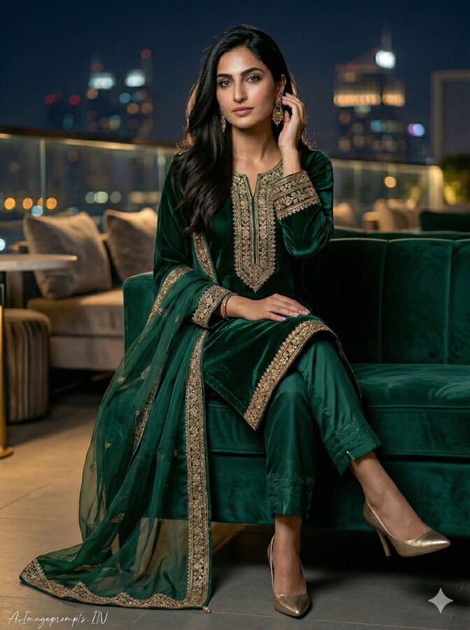 Create a full-body ultra-realistic cinematic portrait of a graceful woman sitting elegantly on a luxury rooftop lounge at night under soft ambient lighting, designed with a premium fashion editorial aesthetic and ultra-HD face clarity. FACE LOCK — ZERO MODIFICATION POLICY Use the uploaded reference image for the woman’s face. Face must remain 100% identical. Preserve exact eyes, nose, lips, cheeks, skin tone, and proportions. No beautification, no smoothing, no reshaping. FACE CLARITY PRIORITY Face must be ultra-HD sharp, crystal-clear with natural skin texture, visible pores, and realistic lighting. No blur or smoothing. Face must be the sharpest element. ASPECT RATIO • 3:4 vertical STYLE Ultra-realistic high-end fashion photography, cinematic luxury editorial style, 8K ultra detail. SCENE A premium rooftop lounge setup with velvet seating, soft cushions, glass railing, and a blurred city skyline glowing in the background at night. POSE • Sitting gracefully on a velvet sofa • One leg slightly crossed over the other • One hand resting on knee • Other hand gently touching hair • Relaxed yet elegant posture EXPRESSION Calm, poised, and confident expression with soft eyes and natural elegance. OUTFIT Deep emerald green velvet salwar kameez with a soft matte-gloss texture • Intricate antique gold embroidery on neckline, cuffs, and hem • Straight-cut trousers with subtle detailing • Sheer organza dupatta with embroidered borders JEWELLERY • Statement gold earrings • Minimal bangles FOOTWEAR • Elegant gold heels HAIR • Smooth silky hair styled with soft waves LIGHTING • Soft warm rooftop lighting • Gentle highlights on face and outfit • Subtle rim light on hair BACKGROUND • Blurred city skyline with glowing lights • Rooftop lounge details • Depth with soft bokeh CAMERA & COMPOSITION • DSLR 85mm lens • Slight side-angle fashion shot • Full-body composition • Ultra sharp face with shallow depth-of-field NEGATIVE PROMPT face blur, identity change, plastic skin, CGI look, distorted anatomy, extra limbs, overexposed lighting, cartoon effect TEXT / SIGNATURE Add “AiImageprompts.IN” at the bottom-left corner, HANDWRITTEN SIGNATURE-STYLE typography, thin cursive strokes, small size, subtle premium elegance, white or soft off-white color.