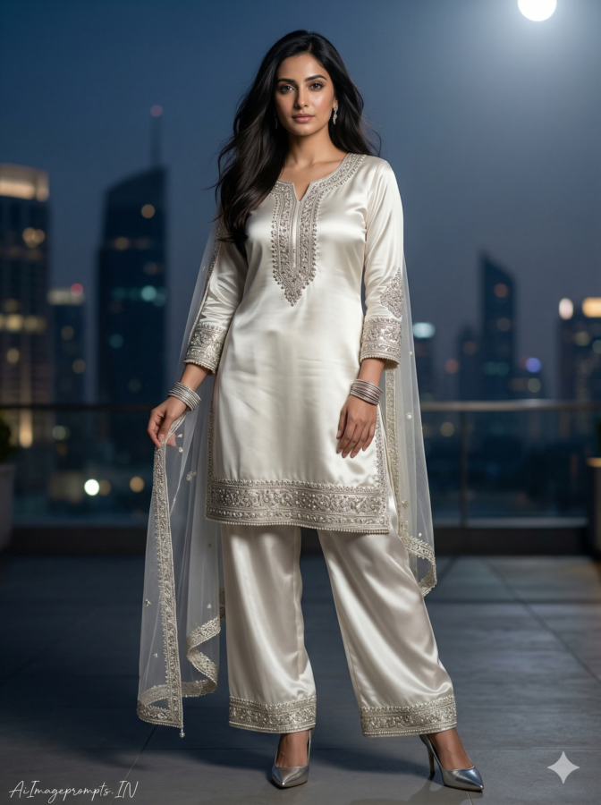 Create a full-body ultra-realistic cinematic portrait of a graceful woman sitting elegantly on the edge of a modern rooftop ledge at night, designed with a soft luxury editorial aesthetic and ultra-HD face clarity. FACE LOCK — ZERO MODIFICATION POLICY: use the uploaded reference image for the woman’s face and keep it 100% identical, preserving the exact eyes, nose, lips, cheeks, skin tone, and facial proportions with no beautification, smoothing, or reshaping. FACE CLARITY PRIORITY: the face must be ultra-HD sharp and crystal clear, showing natural skin texture, visible pores, and realistic lighting, with no blur or artificial smoothing, making the face the sharpest element in the image. Aspect ratio 3:4 vertical. Style: ultra-realistic cinematic fashion photography with a soft luxury editorial look and 8K ultra detail. Scene: a high-rise rooftop edge at night with a softly blurred glowing city skyline behind, subtle ambient lighting, and a calm elegant nighttime atmosphere. Pose: sitting gracefully on the rooftop ledge with both legs slightly angled to one side, one hand resting beside her on the surface for support while the other is gently placed on her lap, with a slight forward lean creating an elegant posture. Expression: soft calm expression with gentle confidence and natural elegance. Outfit: pastel lavender silk salwar kameez with a smooth satin finish, fine silver thread embroidery along the neckline and hem, straight trousers with minimal detailing, and a lightweight sheer dupatta draped softly. Jewellery: delicate silver earrings and minimal bangles. Footwear: elegant nude or silver heels. Hair: soft wavy hair styled naturally. Lighting: soft moonlight illuminating the face, gentle highlights reflecting on the fabric, and smooth cinematic shadows adding depth. Background: blurred city skyline with warm glowing lights, depth-enhancing bokeh, and a clean minimal rooftop environment. Camera & composition: DSLR 85mm lens, slight side-angle framing, full-body vertical composition, ultra-sharp face with soft background blur for cinematic depth-of-field. Negative prompt: face blur, identity change, plastic skin, CGI look, distorted anatomy, extra limbs, overexposed lighting, cartoon effect. Text / Signature: add “AiImageprompts.IN” at the bottom-left corner in small handwritten signature-style typography with thin cursive strokes, subtle premium elegance, white or soft off-white color..