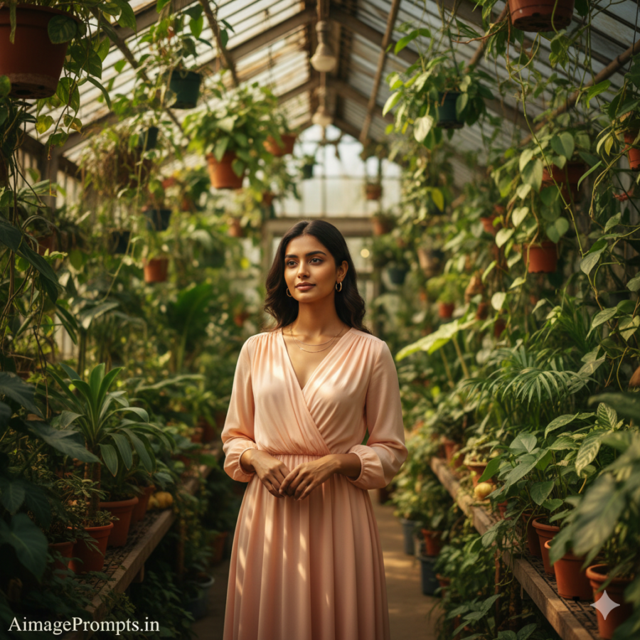 Ultra-realistic vertical 8K HD portrait of an elegant young Indian woman standing inside a lush botanical greenhouse filled with vibrant green plants and leaves. She is wearing a soft pastel dress with delicate minimalist jewelry, complementing her natural Indian beauty. Warm sunlight gently filtering through the greenhouse glass and leaves, creating soft highlights and natural shadows. Calm, serene expression with eco-elegant and peaceful vibes, natural earthy tones, realistic Indian skin texture, sharp focus, professional fashion photography style, cinematic depth of field, realistic lighting, Instagram-ready aesthetic. Add the text “AiImagePrompts.in” in subtle white or off-white color at the bottom-left corner only.