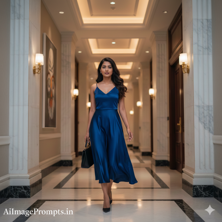 Ultra-detailed vertical 8K HD portrait of a confident young Indian woman walking gracefully through a luxury hotel corridor. She is wearing an elegant satin midi dress paired with matching heels and carrying a chic designer handbag. Soft golden ambient lighting reflecting off polished marble floors and walls, creating a warm luxury atmosphere. Sophisticated hotel interiors with modern decor, clean lines, and subtle reflections. Elegant walking pose with natural confidence, high-fashion Instagram aesthetic, realistic Indian facial features, natural brown skin tone, visible skin texture, sharp focus, professional fashion photography, cinematic depth of field, realistic lighting. Add the text “AiImagePrompts.in” in subtle white or off-white color at the bottom-left corner only.