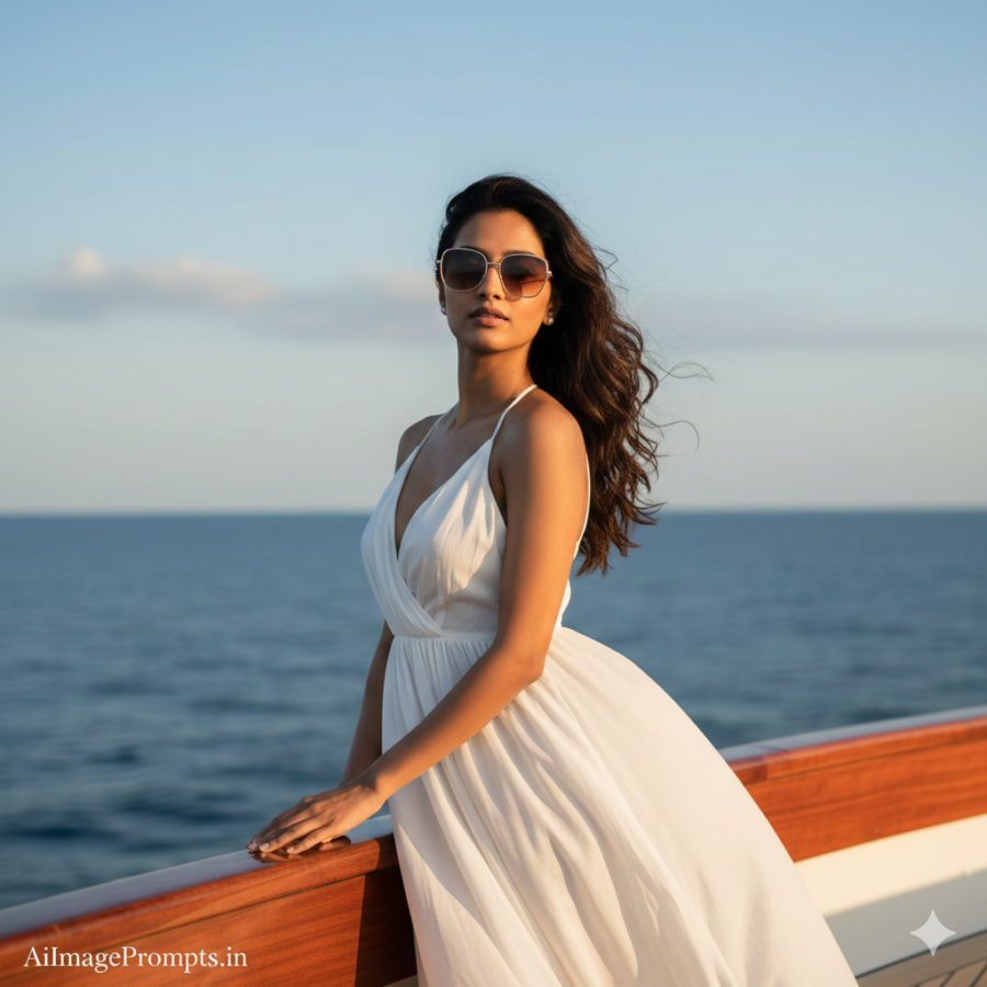 Ultra-realistic vertical 8K HD portrait of an elegant young Indian woman posing confidently on a premium luxury yacht deck. She is wearing a white flowy summer dress and stylish sunglasses, with warm golden sunlight illuminating her natural brown skin tone. Gentle ocean breeze softly flowing through her hair and dress, calm and confident expression, relaxed luxury travel vibe, ocean and clear sky in the background. High-end fashion editorial photography style, realistic Indian facial features, natural skin texture, sharp focus, professional DSLR look, cinematic depth of field, realistic lighting. Add the text “AiImagePrompts.in” in subtle white or off-white color at the bottom-left corner only.