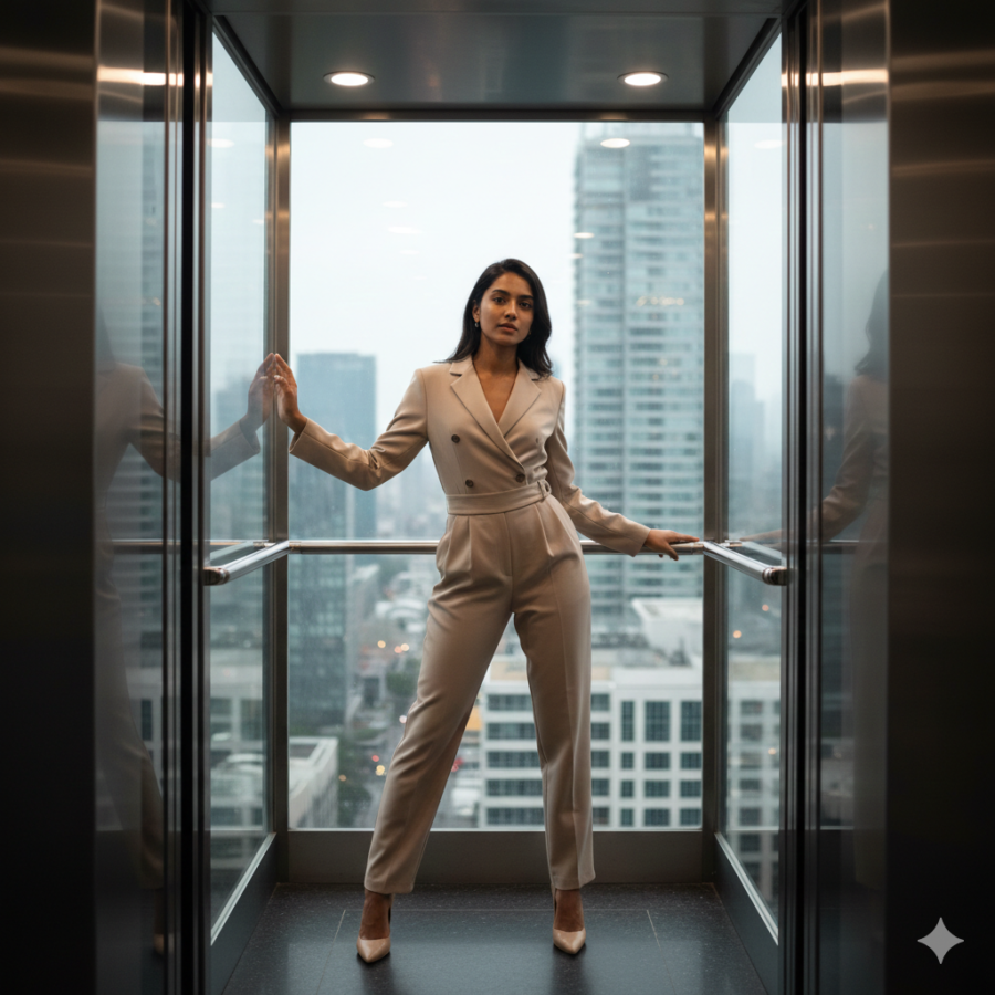 Ultra-realistic vertical 8K HD portrait of a confident young woman posing inside a modern transparent glass elevator. She is styled in a tailored neutral-toned jumpsuit paired with elegant heels, showcasing a sleek high-fashion corporate look. Clean architectural lines, glass walls with subtle light reflections, soft ambient lighting creating natural highlights and shadows. Strong yet elegant body language, poised stance, minimal luxury aesthetic, modern city backdrop visible through glass. High-end fashion editorial photography style, realistic skin texture, sharp focus, cinematic depth of field, professional camera quality, luxury-corporate Instagram reel vibe.