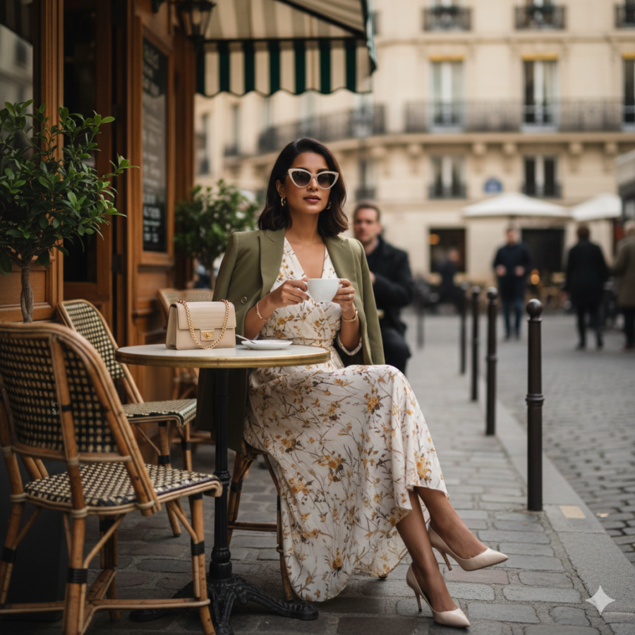 Ultra-realistic vertical 8K HD portrait of an elegant woman sitting at a charming vintage café along a European cobblestone street. She is wearing a flowy dress layered with a chic tailored blazer and stylish sunglasses, exuding relaxed confidence. Soft daylight tones with natural sunlight illuminating the scene, warm café textures, classic outdoor café table and chairs, historic architecture in the background. Travel-inspired elegance with a Parisian Instagram aesthetic, cinematic depth of field, realistic skin texture, sharp focus, professional fashion photography look, natural colors, realistic lighting.