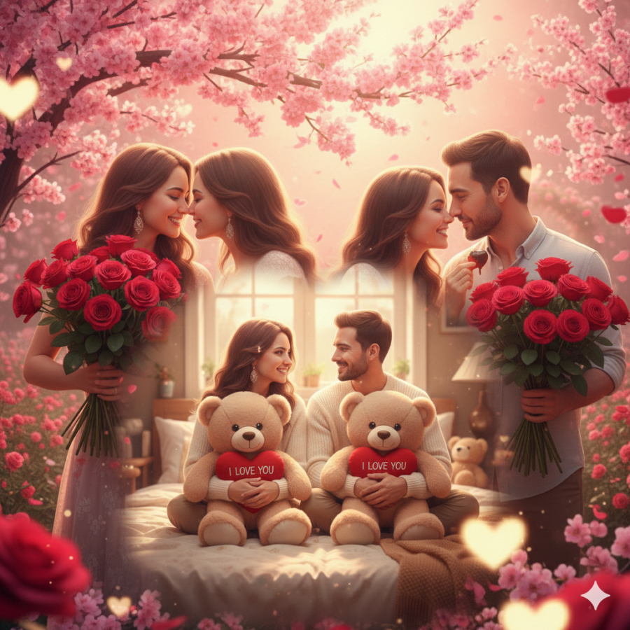 Create a seamless Valentine’s Week montage from couple photos: blend rose garden, chocolate sharing, teddy hugs, passionate kiss elements, soft heart overlays, warm vintage filter, photorealistic portraits, exact faces preserved, ideal for one-share image.
