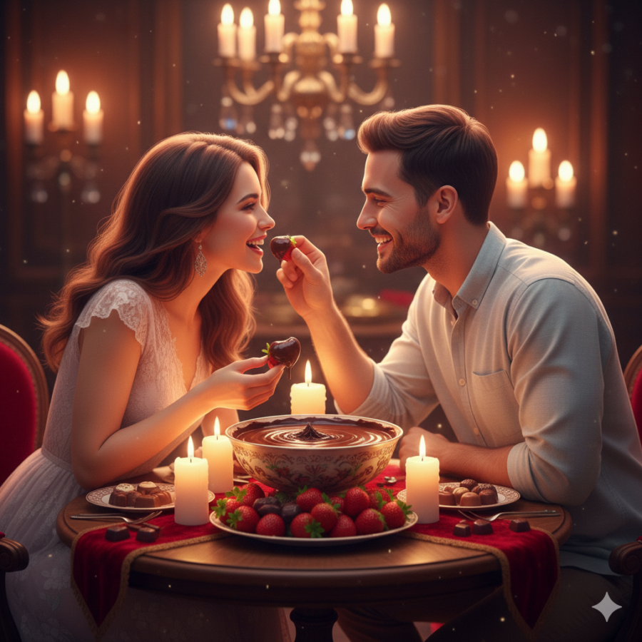 Create a cozy Chocolate Day edit: couple playfully feeding each other luxury chocolates and strawberries dipped in melted chocolate, warm candlelit table, red velvet accents, intimate close-up smiles, photorealistic, joyful loving expressions, exact facial features preserved perfectly.