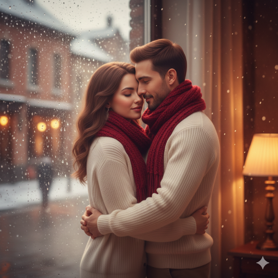 Edit into a tender Hug Day portrait: tight loving hug, rainy window or snowy evening background, cozy scarves and warm glow, heartfelt comfort, deep red-pink tones, photorealistic, strong emotional connection, no changes to appearances