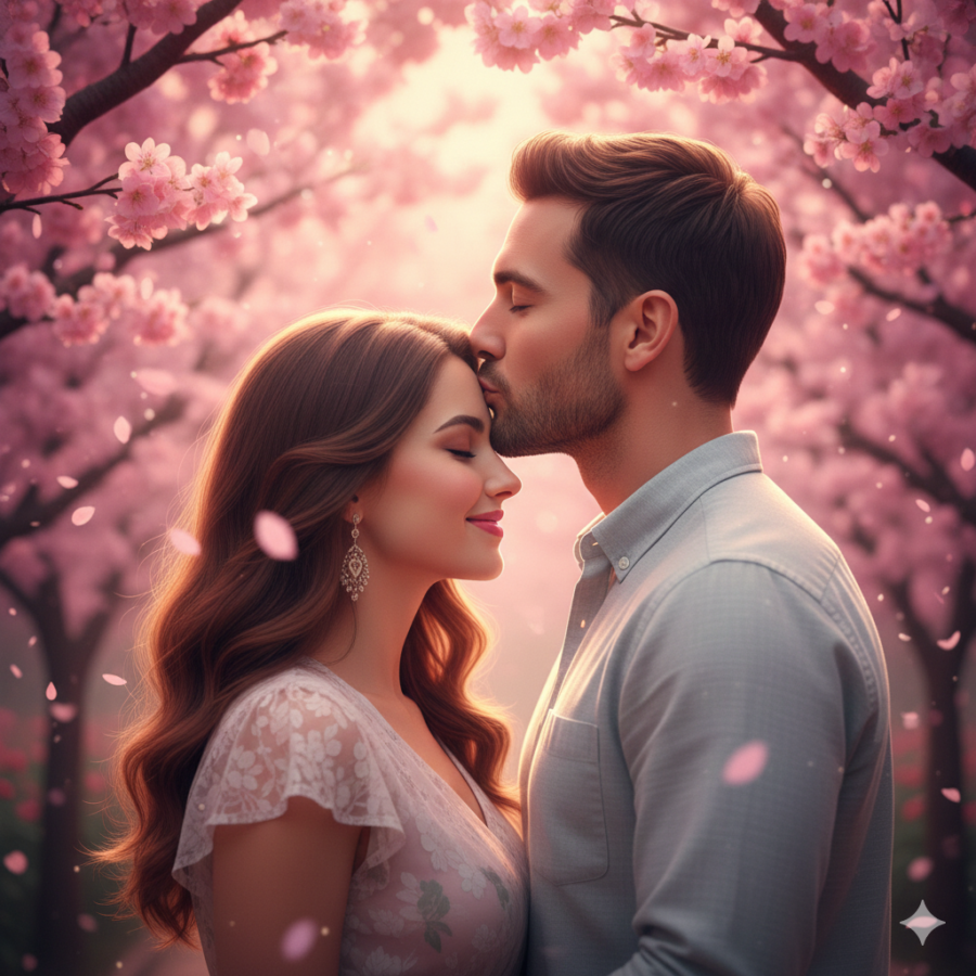 Transform to passionate Kiss Day close-up: gentle lips or forehead kiss under falling cherry blossoms or soft rain, moody romantic lighting, intense sweet expressions, high detail, photorealistic faces exactly as uploaded, dreamy atmosphere.