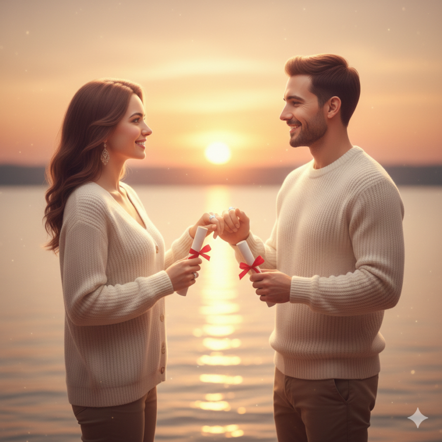 Apply to the couple photo: Promise Day commitment scene, pinky promise or holding hands with notes, serene lake at golden sunset, emotional deep gaze, subtle promise rings glowing, romantic soft focus, photorealistic, preserve real faces perfectly