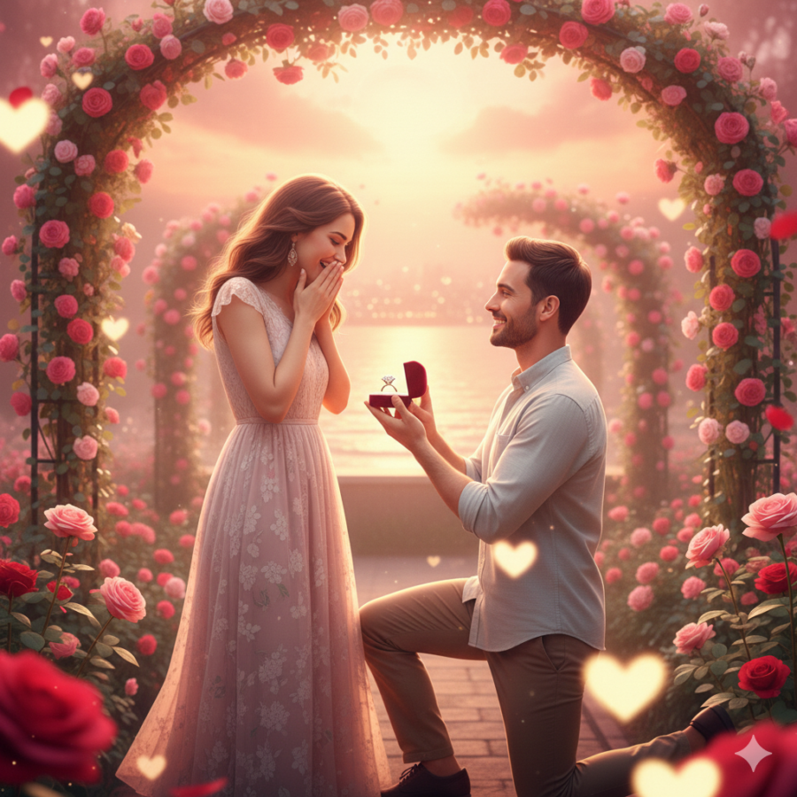 Transform the couple in the photo to a romantic Propose Day scene: one kneeling with a sparkling diamond ring, the other emotional and joyful, golden hour rooftop or beach background, soft dramatic lighting, subtle floating hearts, photorealistic, keep original faces unchanged, cinematic depth of field.