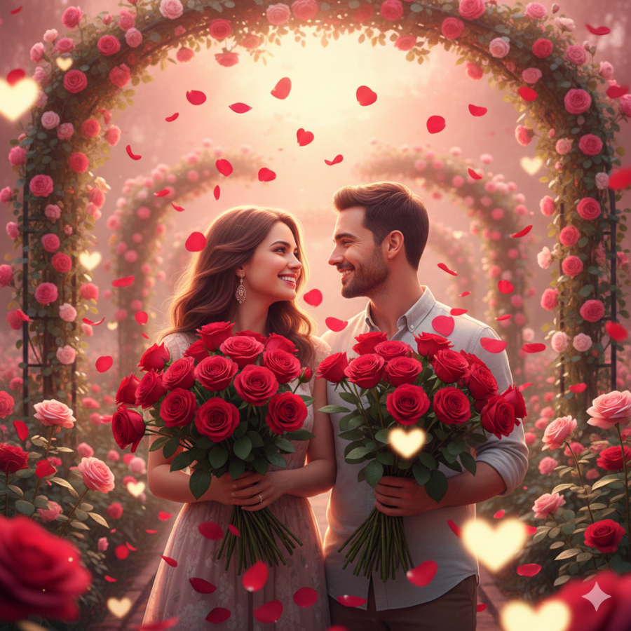 Edit the uploaded couple photo into a dreamy Rose Day garden at sunset: holding vibrant red roses, gentle wind carrying petals, soft pink-red glow, loving smiles and eye contact, heart-shaped bokeh, photorealistic, preserve exact faces and identities, ultra-detailed romantic mood.