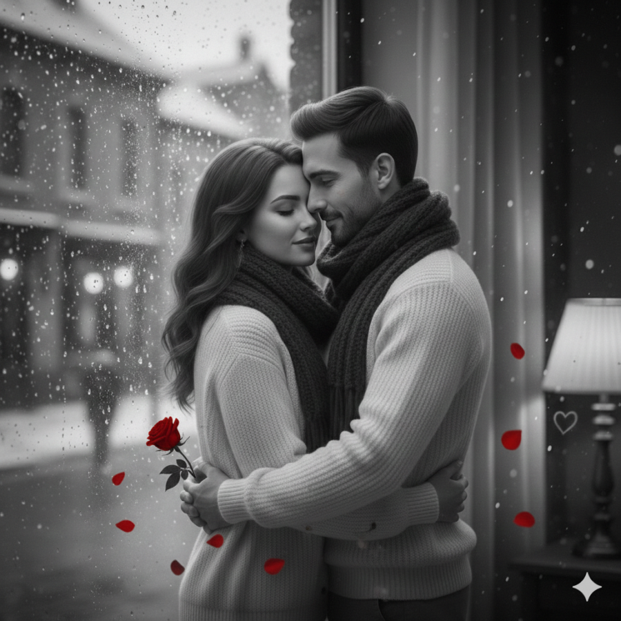 Elegant black-and-white Valentine’s portrait edit with red heart/rose accents: classic embrace, dramatic soft lighting, cinematic romance style, magazine-quality detail, ultra-realistic faces unchanged, timeless romantic feel
