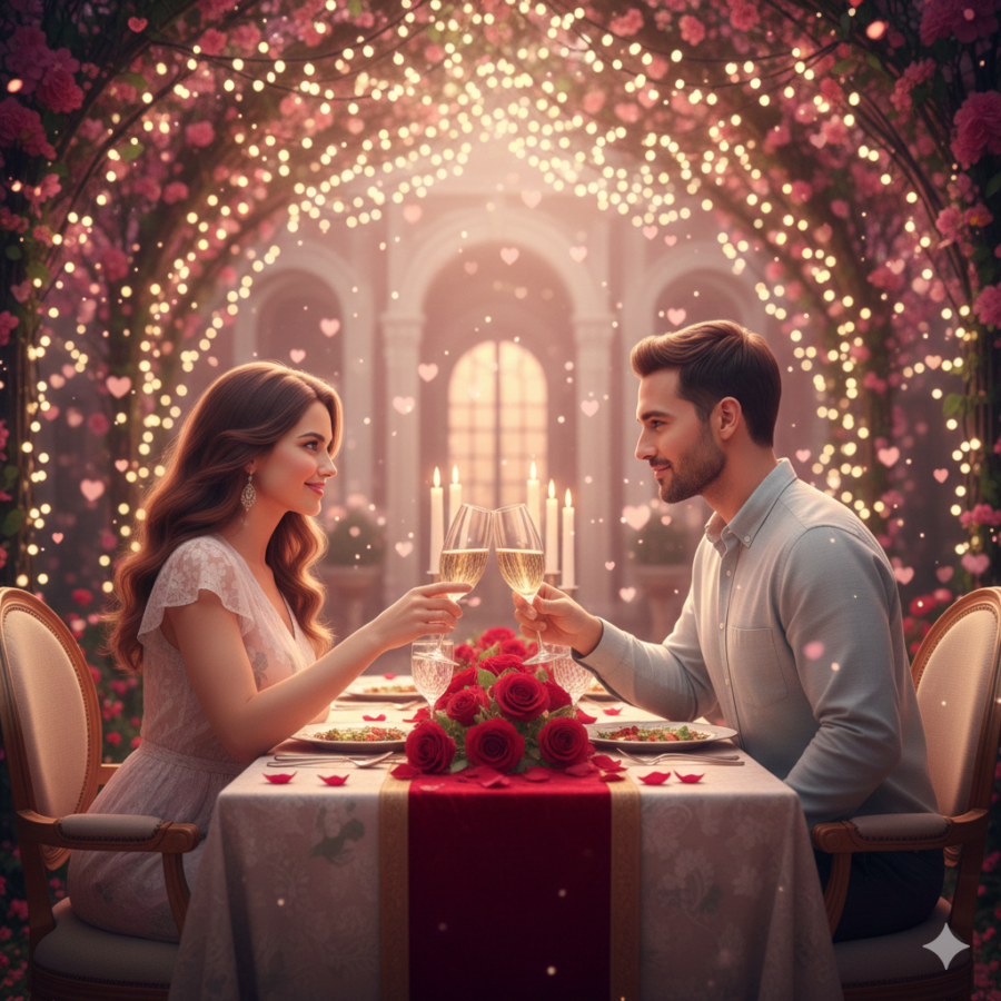Generate a grand Valentine’s Day masterpiece: elegant fairy-light dinner, champagne toast, red roses and heart bokeh everywhere, loving gazes, ultra-realistic, soft pink-red cinematic glow, preserve identities, celebratory romantic mood